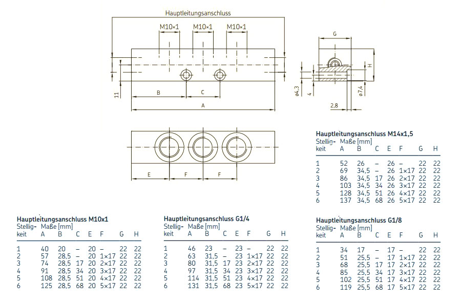 - Hauptleitungsanschluss: G 1/8, G 1/4, M10x1 oder M14x1,5